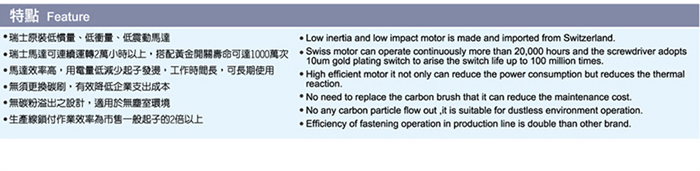 瑞士原裝低慣量、低沖量、低震動馬達(dá)。瑞士馬達(dá)可連續(xù)運(yùn)轉(zhuǎn)2萬小時以上,搭配白金開關(guān)壽命可達(dá)1000萬次。馬達(dá)效率高,用電量低減少起子發(fā)燙,工作時間長,可長期使用。無須更換碳刷,有效降低企業(yè)支出成本。無碳粉溢出之設(shè)計,適用於無塵室環(huán)境。生產(chǎn)線鎖付作業(yè)效率為市售一般起子的2倍以上。
